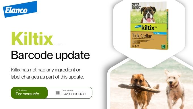 Kiltix29/09/25 Elanco wishes to advise you of an upcoming change to Kiltix flea and tick collar for dogs, material number 1001905. The EAN barcode for this product has been updated and is effective immediately, please see table below of full information.