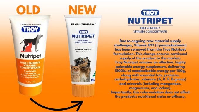 Troy Nutripet23/09/25 Troy would like to advise you of a change to the formulation and packaging of Troy Nutripet (1550). The difference is the removal of Vitamin B12 (Cyanocobalamin). This change has been made to ensure that supply of this product can continue in the market in the face of ongoing raw material supply issues. Troy Nutripet is primarily an energy supplement, consisting of fats, proteins and carbohydrates in a very palatable base. It provides 1500 kilojoules of metabolisable energy per 100g. Troy Nutripet has the added benefit of providing multiple vitamins (B vitamins, along with vitamins A, D and E) and minerals (including manganese, magnesium and iodine). The removal of cyanocobalamin from the formulation will not have an impact on this claim. |