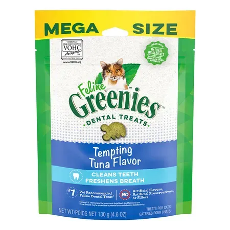 Cat dental care has never been easier, or more delicious. It’s a difference you’ll see.Feline GREENIES™ Dental Treats are the #1 Vet Recommended dental treat*, approved by VOHC (Veterinary Oral Health Council) for tartar reduction. The unique teeth-cleaning shape and crunchy texture of FELINE GREENIES™ Dental Treats help your cat maintain optimal dental care and overall good health.*Among U.S. veterinarians who recommend dental treats for at-home oral care.