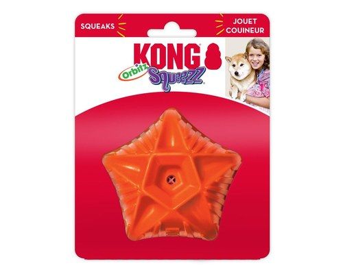 KONG Squeezz Orbitz’ dynamic bounce-and-roll action launches dogs into a universe of healthy interactive play fueled by irresistibly unpredictable rebounds that satisfy chasing instincts. These vibrant, textured spinning satellites of fun squeak to extend play and feature a textured, grippy surface that makes grabbing easy.