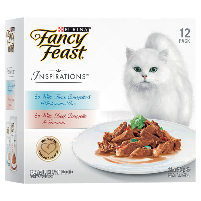 FANCY FEAST INSPIRATIONS TUNA, COURGETTE & WHOLEGRAIN RICE IS FINE, DELICATE CUTS OF TUNA COMBINED WITH CAREFULLY SELECTED INGREDIENTS INCLUDING COURGETTE AND WHOLEGRAIN RICE.