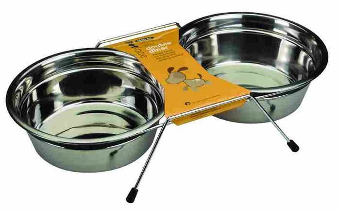 Petface stainless steel pet feeding station. Offers food and water in one location without being moved, avoiding spilling contents everywhere. Raised height allows your pet to eat at a proper height to help promote better digestion. A handy double feed dish on a sturdy raised wire frame. Rubber bowl bumpers eliminate noise and the frame is fitted with an anti-slip base.