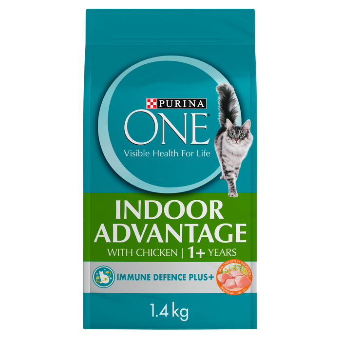 PURINA ONE® INDOOR ADVANTAGE with IMMUNE DEFENCE PLUS+ has been specially formulated with beta glucans, vitamin C & E and omega 3 & 6 fatty acids. Working in parallel this blend helps support first line immune defence for your cat:• Vitamin E & C are natural antioxidants that help prevent cell damageassociated with aging and poor health• Omega 3 & 6 fatty acids helps keep skin healthy to maintain a strong barrierto the external environment• Beta glucans to help support optimal immune response.PURINA ONE® Adult Indoor Advantage Dry Cat Food with Chicken contains prebiotic fibre to help reduce faecal aroma by promotingbalanced gut flora. Reduced calorie diet helps promote a healthy weight for your cat.