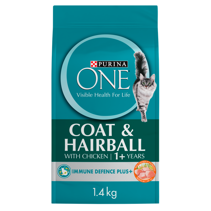 PURINA ONE® Coat & Hairball with IMMUNE DEFENCE PLUS+ has been specially formulated with beta glucans, vitamin C & E and omega 3 & 6 fatty acids. Working in parallel this blend helps support first line immune defence for your cat:• Vitamin E & C are natural antioxidants that help prevent cell damageassociated with aging and poor health• Omega 3 & 6 fatty acids helps keep skin healthy to maintain a strong barrierto the external environment• Beta glucans to help support optimal immune responsePURINA ONE® Adult Coat & Hairball Dry Cat Food with Chicken contains a blend of natural plant fibres to help minimise hairballs and omega 3 & 6 fatty acids to give your cat a radiant coat and help nourish and protect their skin.