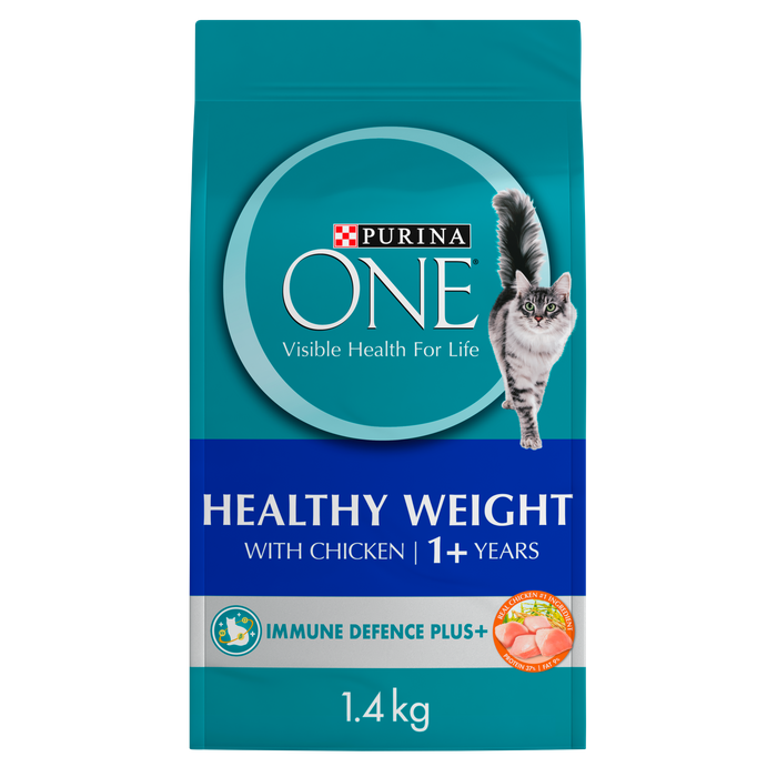 PURINA ONE® Healthy Weight with IMMUNE DEFENCE PLUS+ has been specially formulated with beta glucans, vitamin C & E and omega 3 & 6 fatty acids. Working in parallel this blend helps support first line immune defence for your cat:• Vitamin E & C are natural antioxidants that help prevent cell damageassociated with aging and poor health• Omega 3 & 6 fatty acids helps keep skin healthy to maintain a strong barrierto the external environment• Beta glucans to help support optimal immune response.PURINA ONE® Healthy Weight Dry Cat Food with Chicken is formulated with adapted nutrient profile to maintain healthy body condition in cats who have a tendency to gain weight. Plant fibres, L-carnitine and high quality protein sources work in combination with reduced calories to help cats reach and maintain healthy weight.