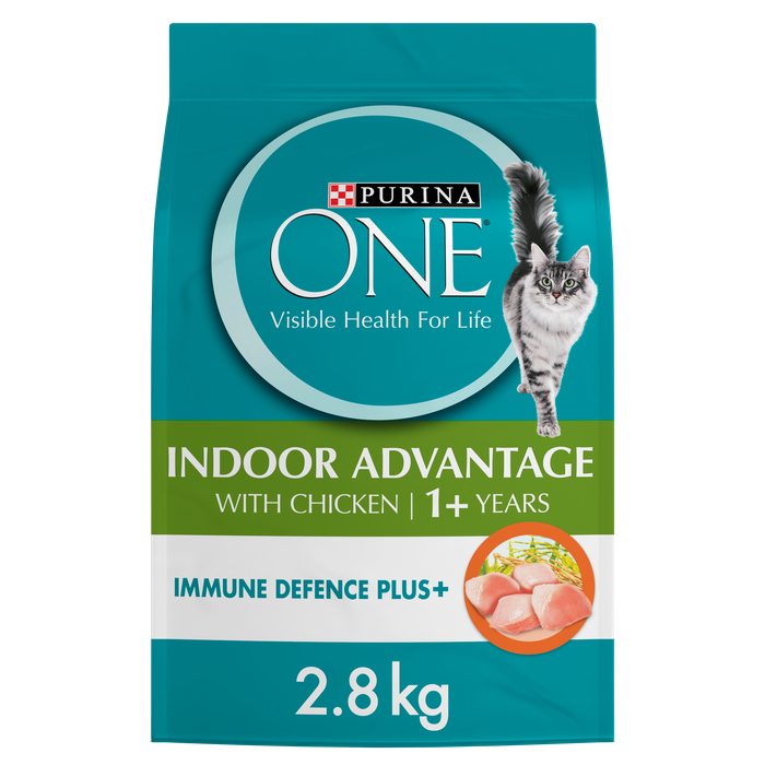 PURINA ONE® INDOOR ADVANTAGE with IMMUNE DEFENCE PLUS+ has been specially formulated with beta glucans, vitamin C & E and omega 3 & 6 fatty acids. Working in parallel this blend helps support first line immune defence for your cat:• Vitamin E & C are natural antioxidants that help prevent cell damageassociated with aging and poor health• Omega 3 & 6 fatty acids helps keep skin healthy to maintain a strong barrierto the external environment• Beta glucans to help support optimal immune response.PURINA ONE® Adult Indoor Advantage Dry Cat Food with Chicken contains prebiotic fibre to help reduce faecal aroma by promotingbalanced gut flora. Reduced calorie diet helps promote a healthy weight for your cat.