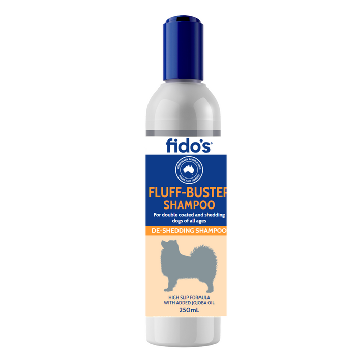 Fido’s Fluff Buster Shampoo is soap-free and Hypoallergenic.Idea for Husky, Samoyed, Border Collie, German Shephards and other breeds with Double Coats.Suitable for use with long term flea preparations