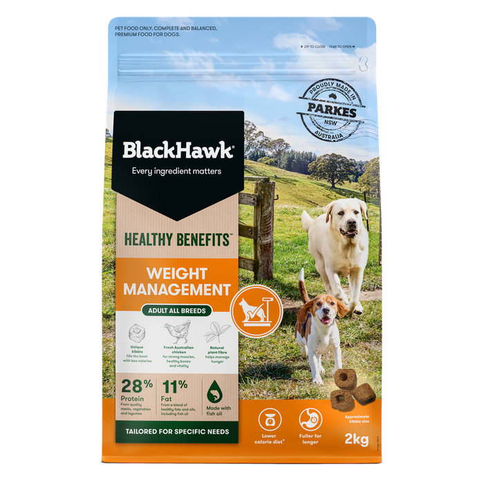 At Black Hawk, Every Ingredient Matters®. Black Hawk Healthy Benefits Weight Management has been specifically developed as a lower calorie* diet by our animal nutritionists and vets, to help adult dogs maintain a healthy weight. Made with fresh Australian chicken, this tasty kibble has the essential amino acids dogs need for building and maintaining strong muscles and healthy bones. It also includes supplementary L-carnitine to help boost fat metabolism, and is rich in vitamins and minerals, so your dog gets all their daily nutrients without the extra calories. The unique kibble shape fills your dog’s bowl and helps slow their eating, with ingredients to help them feel fuller for longer. With Black Hawk Healthy Benefits Weight Management, you can provide your dog with great tasting meals and complete nutrition, while managing their weight to ensure optimal health and wellbeing. *9% less calories than Black Hawk Chicken & Rice