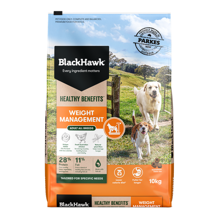 At Black Hawk, Every Ingredient Matters®. Black Hawk Healthy Benefits Weight Management has been specifically developed as a lower calorie* diet by our animal nutritionists and vets, to help adult dogs maintain a healthy weight. Made with fresh Australian chicken, this tasty kibble has the essential amino acids dogs need for building and maintaining strong muscles and healthy bones. It also includes supplementary L-carnitine to help boost fat metabolism, and is rich in vitamins and minerals, so your dog gets all their daily nutrients without the extra calories. The unique kibble shape fills your dog’s bowl and helps slow their eating, with ingredients to help them feel fuller for longer. With Black Hawk Healthy Benefits Weight Management, you can provide your dog with great tasting meals and complete nutrition, while managing their weight to ensure optimal health and wellbeing. *9% less calories than Black Hawk Chicken & Rice