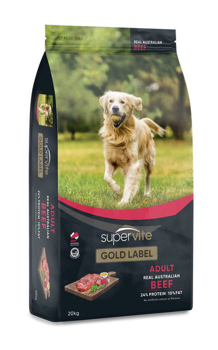 SuperVite Gold Label Adult Beef made with Real Australian Beef, is a complete and balanced dry dog food. This well crafted, gourmet recipe is infused with premium quality ingredients to give your dog the right nutrition and delicious taste.