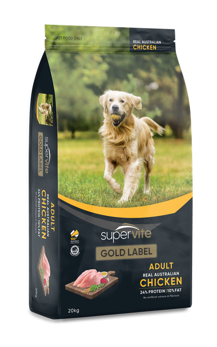 SuperVite Gold Label Adult Chicken made with Real Australian Chicken, is a complete and balanced dry dog food. This well crafted, gourmet recipe is infused with premium quality ingredients to give your dog the right nutrition and delicious taste.