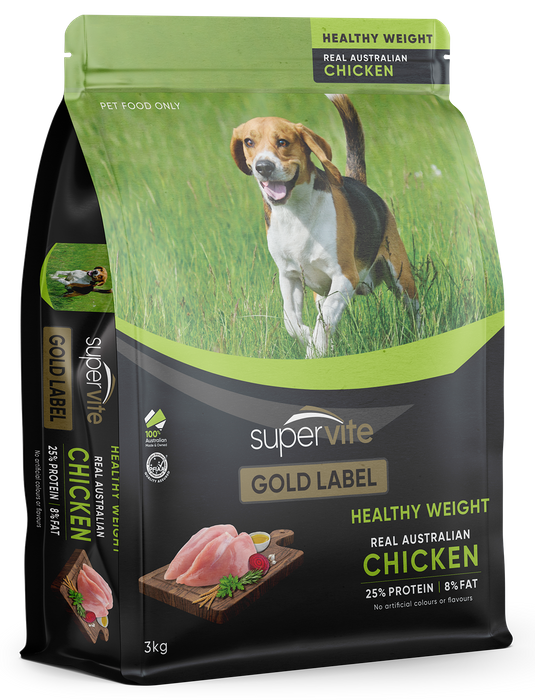 SuperVite Gold Label Healthy Weight is made with Real Australian Chicken, is a complete and balanced dry dog food. This well crafted, gourmet recipe is infused with premium quality ingredients to give your dog the right nutrition and delicious taste.
