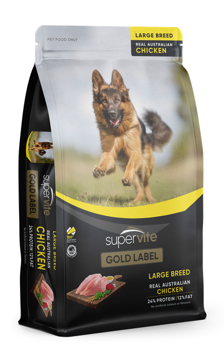 SuperVite Gold Label Large Breed made with Real Australian Chicken, is a complete and balanced dry dog food. This well crafted, gourmet recipe is infused with premium quality ingredients to give your dog the right nutrition and delicious taste.