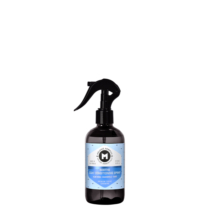 The Soothe Conditioning / De tangling spray is designed to return condition to the coat, leaving it silky. Using therapeutic grade essential oils to hydrate and strengthen while smoothing out the cuticle and eliminating frizz and fly away coat. It can be used with a wet or dry coat and in between brushing during the bathing process. Provides thermal protection while using hair dryers that may be used while styling your dog’s coat.What are the benefits of using Melanie Newman Soothe Coat Conditioning Sprays?Melanie Newman Salon Essentials Soothe collection is formulated for all breed types that require the most gentle of grooms, The Soothe collection will leave your pets skin and coat shiny and frizz-free.