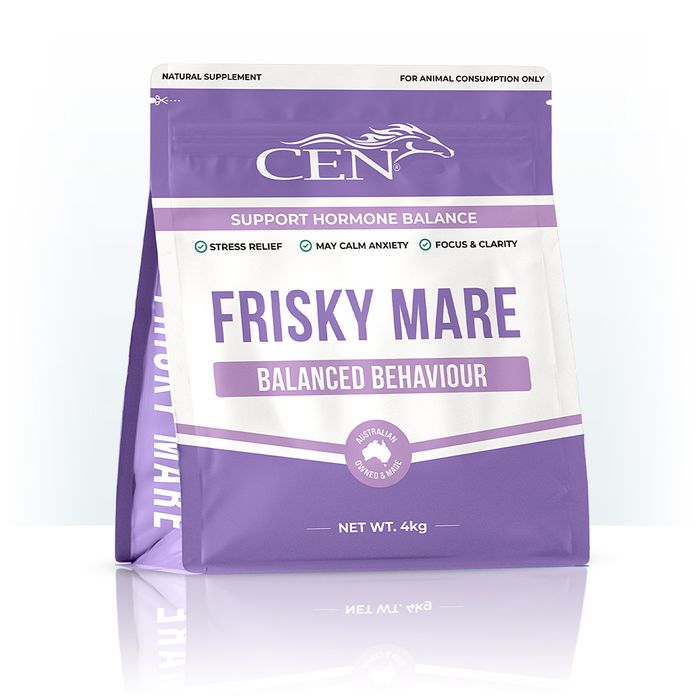 CEN FRISKY MARE IS DESIGNED TO AID IN MAINTAINING THE NORMAL HORMONAL BALANCE OF MARES, ESPECIALLY WHEN THEIR TEMPERAMENT AND MARE-ISH BEHAVIOUR NEGATIVELY IMPACTS SAFE HANDLING. 100% NATURAL FORMULA AND ENTIRELY SAFE TO HANDLE.9:14PROMOTES THE HEALTHY BALANCE OF HORMONES IN MARESHELPS IN MANAGING THE BEHAVIOR OF TEMPERAMENTAL AND MOODY MARESNATURAL REMEDY FOR TENSION AND IRRITABILITYASSISTS IN MAINTAINING THE REPRODUCTIVE HEALTH OF MARESFOR MANAGING CHALLENGING STALLIONS, COLTS, AND PROUD-CUT GELDINGS.
