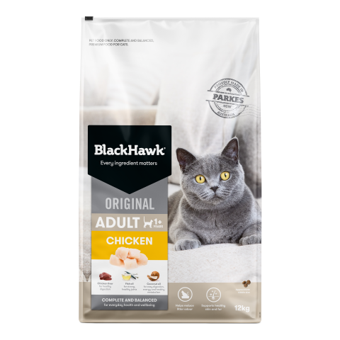 Specifically developed for cats, with proteins and textures they love, and the complete and balanced nutrition they need. Every ingredient that goes into our recipes has a nutritional purpose, so you’ll never find wheat, corn, soy, artificial preservatives, colours or flavours in Black Hawk.Made with real chicken, and essential vitamins and minerals, this tasty kibble offers complete, balanced nutrition for your adult cat. A range of carefully selected ingredients such as green-lipped mussel, chicken liver and egg helps your cat maintain strong bones and joints, and supports good digestion and healthy skin and fur.