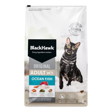 Specifically developed for cats, with proteins and textures they love, and the complete and balanced nutrition they need. Every ingredient that goes into our recipes has a nutritional purpose, so you’ll never find wheat, corn, soy, artificial preservatives, colours or flavours in Black Hawk.With the delicious flavour of real ocean fish, this tasty recipe offers complete and balanced nutrition for your adult cat. A carefully selected range of ingredients, including green-lipped mussel, sweet potato and egg helps your cat maintain strong bones and joints, supports their digestion and promotes healthy skin and fur.