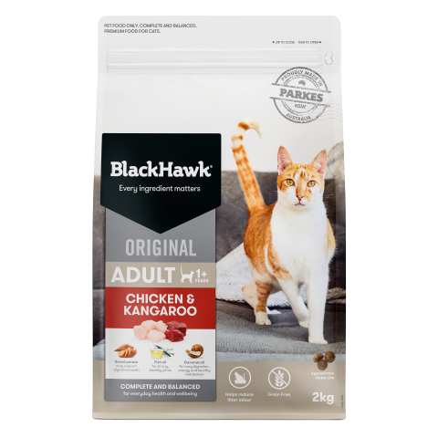 Specifically developed for cats, with proteins and textures they love, and the complete and balanced nutrition they need. Every ingredient that goes into our recipes has a nutritional purpose, so you’ll never find wheat, corn, soy, artificial preservatives, colours or flavours in Black Hawk.With all the goodness of real Australian chicken and kangaroo, this tasty and grain-free kibble offers complete, balanced nutrition for your adult cat. A carefully selected range of ingredients, including green-lipped mussel, sweet potato, chicken liver and egg, helps your cat maintain strong bones and joints, supports their digestion and promotes healthy fur.