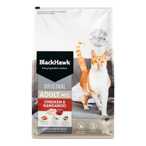 Specifically developed for cats, with proteins and textures they love, and the complete and balanced nutrition they need. Every ingredient that goes into our recipes has a nutritional purpose, so you’ll never find wheat, corn, soy, artificial preservatives, colours or flavours in Black Hawk.With all the goodness of real Australian chicken and kangaroo, this tasty and grain-free kibble offers complete, balanced nutrition for your adult cat. A carefully selected range of ingredients, including green-lipped mussel, sweet potato, chicken liver and egg, helps your cat maintain strong bones and joints, supports their digestion and promotes healthy fur.
