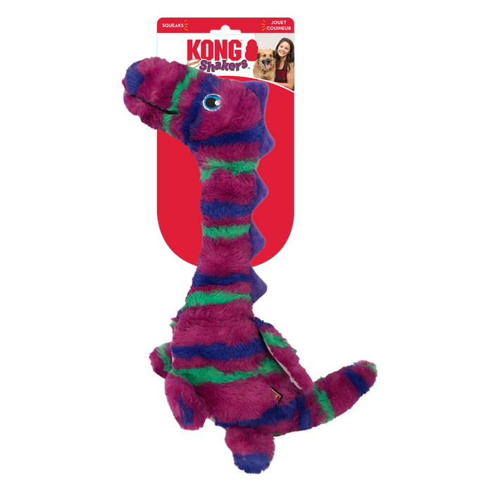 KONG Shakers Honkers Dragon’s magic lies in his internal neck tube that delights dogs’ natural instincts with an irresistible crunch that kicks up the fetching fun. His long, floppy body fuels shaking action and is great for tugging while the low tone squawk sparks interest and keeps dogs playing longer with a plush-covered pal great for cuddling in the liar after the action.