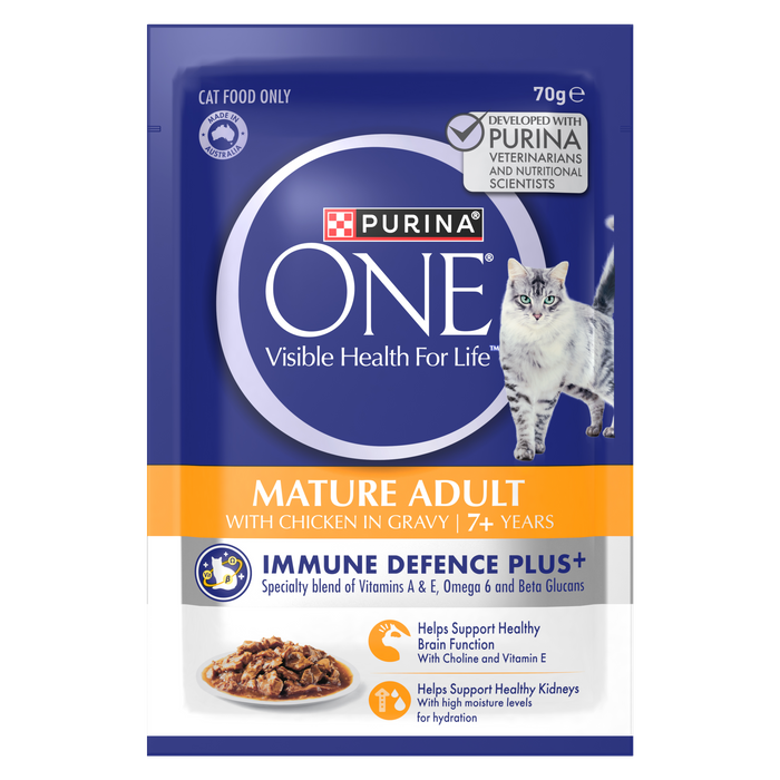 PURINA ONE® MATURE ADULT WET NOW IS FORMULATED WITH IMMUNE DEFENCE PLUS+, A SPECIAL BLEND OF VITAMINS A & E, OMEGA 6 AND BETA GLUCANS TO HELP SUPPORT YOUR CAT’S NATURAL DEFENCES FROM THE INSIDE OUT. DEVELOPED WITH PURINA VETERINARIANS AND NUTRITIONAL SCIENTISTS, PURINA ONE® MATURE ADULT WET IS 100% COMPLETE AND BALANCED NUTRITION MADE WITH REAL CHICKEN, BECAUSE DELICIOUS TASTE COMBINED WITH SUPERIOR NUTRITION IS AT THE HEART OF YOUR CAT’S HEALTH AND HAPPINESS. FEED PURINA ONE® DRY AND WET CAT FOOD DAILY FOR A COMPLETE NUTRITION AND TASTE DUO TO SUPPORT YOUR CAT’S 6 VISIBLE SIGNS OF HEALTH; BODY CONDITION, DIGESTION, SKIN/COAT/EYES, IMMUNE SYSTEM, DENTAL HEALTH, AND BONE & JOINT HEALTH.