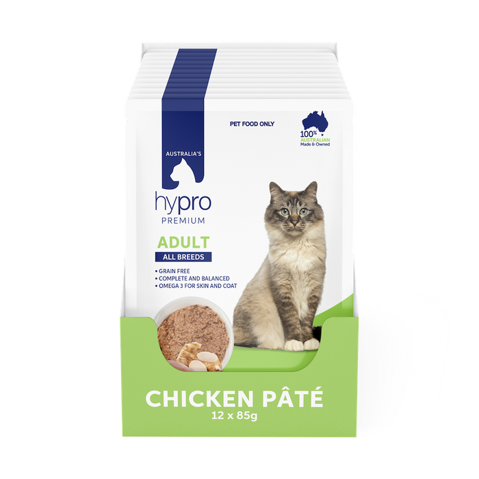 HYPRO PREMIUM GRAIN FREE CHICKEN PÂTÉ FOR ADULT CATS IS CRAFTED FROM CAREFULLY SELECTED SUPERFOODS AND 100% REAL, LOCAL AUSTRALIAN MEAT, MAKING IT NUTRITIONALLY ALIGNED TO THE FLAVOUR AND AROMA OF YOUR CAT’S NATURAL DIET OFFERING A HIGH LEVEL OF PALATABILITY AND ENJOYMENT. WITH NO ARTIFICIAL, FLAVOURS, COLOURS OR PRESERVATIVES, OUR CAT PÂTÉ RANGE OFFERS A HOLISTIC, NUTRITIOUS MEAL TO MAINTAIN THE HEALTH AND WELLBEING FOR CATS OF ALL AGES.