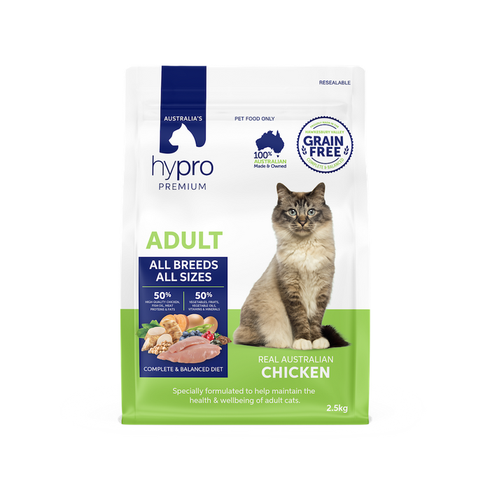 HYPRO PREMIUM GRAIN FREE ADULT CAT CHICKENĀ IS A RICH SOURCE OF PROTEIN WITH LOTS OF HEALTHY, EASY TO DIGEST NUTRIENTS, INCLUDING A VARIETY OF DIFFERENT MINERALS AND VITAMINS THAT SUPPORT STRONG MUSCLES.