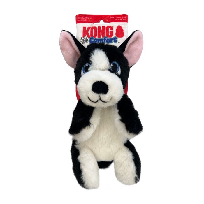 KONG Comfort Pups’ super-plush fur and floppy bodies make them ideal snuggle buddies for cuddling and fetching fun—plus, dogs can play with the crinkly, plush packaging! A squeaker and crinkly ears spark instincts and keeps pups playing while the adorably floppy body makes shaking even more satisfying—with less stuffing for less mess.
