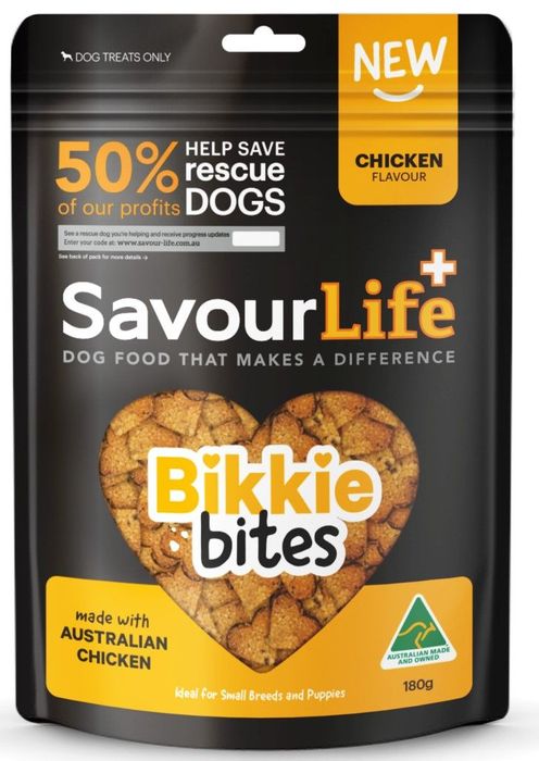 Introducing SavourLife Chicken Flavour Bikkie Bites. These small, heart-shaped bites are perfect for training of all dog breeds, whether you're at home or on the go. Ideal for smaller dog breeds as a reward treat too!Made with real Australian chicken, this recipe has been formulated with a commitment to your dog’s health & wellbeing. Key ingredients include Glucosamine to support optimal joint health, Chicken; a popular source of protein for fussy eaters, and the addition of extra linseed that is high in Omega 3 & 6 fatty acids which can assist in a healthy skin and coat. Oven-baked to perfection, these bites offer a satisfying crunch that supports healthy teeth and gums. Packed with protein, your dog will thrive with each bite. What's more, they contain no artificial flavours, colours, or preservatives, ensuring only the best for your dog.Proudly made in Australia from all-natural ingredients, SavourLife Bikkie Bites are a wholesome choice for your four-legged companion. Choose quality, choose SavourLife for a treat that cares and a brand that saves lives.