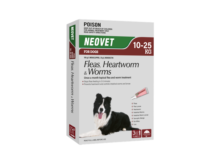 NEOVET for large Dogs 10-25kg will protect your dog from heartworm, intestinal worms, and fleas. NEOVET all-in-one parasite protection is a monthly treatment that is highly effective at killing several parasites at multiple life stages. It protects your dog from heartworm, lungworm, fleas, gastrointestinal worms, lice, and mites, as well as treating SarcopticMange. NEOVET is waterproof and will kill the flea when they come into contact rather than waiting for the parasite to bite your pet. Apply to the back of the dog’s neck with the spot-on applicator. A single dose will also treat ear mite infections