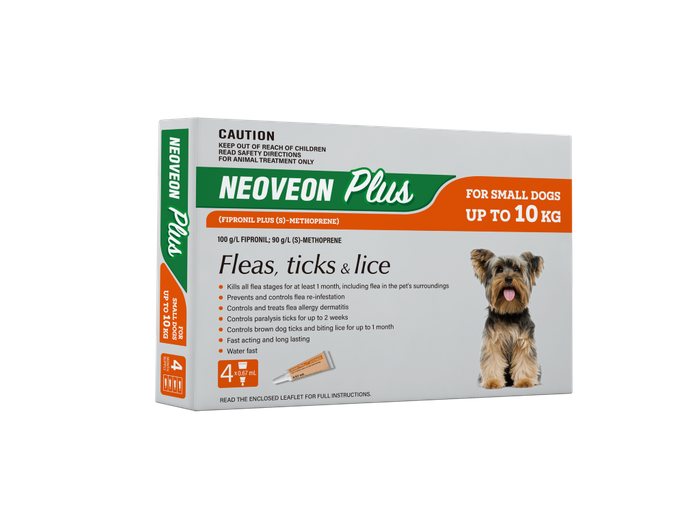 Neoveon Plus for Small Dogs up to 10kg is dependable parasite protection you can trust. Neoveon Plus will protect your dog against fleas. This easy spot-on treatment kills fleas on your dog, plus flea eggs and larvae in their environment. It will also protect your dog against paralysis ticks when applied every two weeks and brown dog ticks when applied monthly. Neoveon Plus also treats and controls flea allergy dermatitis and biting lice and is water resistant so can be used on dogs that are shampooed. Neoveon Plus is safe to use on puppies from 8 weeks of age and safe for use on breeding, pregnant and lactating bitches. Please note that Fipronil, one of the active ingredients, causes fleas to become hyperactive hence more visible before dying.