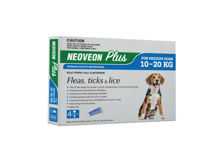 Neoveon Plus for Medium Dogs 10-20kg is dependable parasite protection you can trust. Neoveon Plus will protect your dog against fleas. This easy spot-on treatment kills fleas on your dog, plus flea eggs and larvae in their environment. It will also protect your dog against paralysis ticks when applied every two weeks and brown dog ticks when applied monthly. Neoveon Plus also treats and controls flea allergy dermatitis and biting lice and is water resistant so can be used on dogs that are shampooed. Neoveon Plus is safe to use on puppies from 8 weeks of age and safe for use on breeding, pregnant and lactating bitches. Please note that Fipronil, one of the active ingredients, causes fleas to become hyperactive hence more visible before dying.