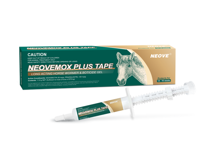 All horses should have a regular parasite control program. Regular treatment will reduce the risk of diseases due to small and large strongyles such as colic and verminous arteritis. Reinfection of horses with worms is common and treatment must be repeated routinely to ensure effective control. The unique long term activity of NEOVEMOX PLUS TAPE LONG ACTING HORSE WORMER AND BOTICIDE GEL against worms, including encysted small strongyles, is particularly useful in reducing the required dosing frequency in strategic parasite control programs. Retreatment intervals for the control of small strongyles can be extended to 14 to 16 weeks. Consult your veterinarian for advice on faecal egg count interpretation and the appropriate program for your specific needs.