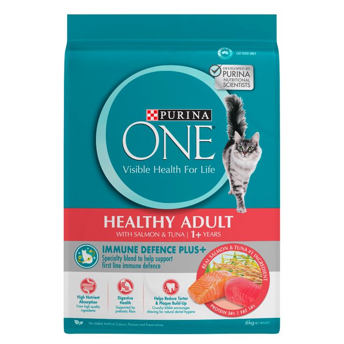 PURINA ONE® Adult with IMMUNE DEFENCE PLUS+ has been specially formulated with beta glucans, vitamin C & E and omega 3 & 6 fatty acids. Working in parallel this blend helps support first line immune defence for your cat:• Vitamin E & C are natural antioxidants that help prevent cell damageassociated with aging and poor health• Omega 3 & 6 fatty acids helps keep skin healthy to maintain a strong barrierto the external environment• Beta glucans to help support optimal immune response. PURINA ONE® Adult Dry Cat Food with Salmon provides complete and balanced nutrition to help your cat stay in good health, whatever the day brings.• High Nutrient Absorption from high quality ingredients• Digestive Health supported by prebiotic fibre• Helps Reduce Tartar & Plaque Build-Up: Crunchy kibble encourages chewing for natural dental hygiene