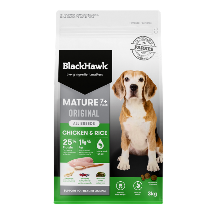 This wholesome, balanced food has been specifically designed to meet the nutritional needs of mature dogs, aged 7+. This great tasting kibble includes 25% natural protein from quality meat, vegetables and grains, as well as 14% fat from healthy, natural sources, including emu oil. The Black Hawk Original Mature Chicken & Rice contains the following:-Made with Real Australian Chicken – a highly digestible, lean and versatile protein packed with the amino acids essential for building strong bones and muscles.-Rice has also been added as an excellent source of carbohydrates, providing all-important energy for your dog’s body and brain.-Chicory root, a natural prebiotic for intestinal health-Blueberries and cranberries, which may help immunity and natural defences; -Green-lipped mussels which may support healthy joints. -Sweet potato is a rich, natural source of fibre that can support your dog’s digestive health and assist with the absorption of vital nutrients.