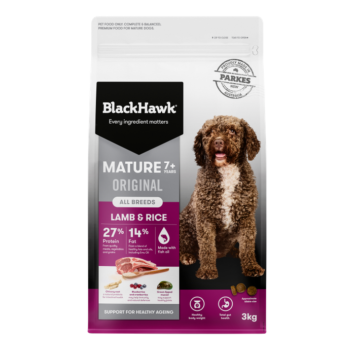 This wholesome real food, to meet the specific nutritional and wellbeing needs of mature dogs, aged 7+. Offering everything your dog needs for a complete and balanced diet, this great-tasting kibble includes 27% natural protein from quality meat, vegetables and grains, as well as 14% fat from healthy, natural sources, including emu oil.The Black Hawk Original Mature Lamb & Rice contains the following:-Grass-fed Australian lamb – a highly digestible protein source rich in iron and vitamin B12, which may help your dog’s heart health. -Rice has also been added as an excellent source of carbohydrates, providing all-important energy for your dog’s body and brain. -Fish oil for healthy skin, a shiny coat and joint support -Green-lipped mussels which may support healthy joints-Sweet potato is a rich, natural source of fibre that can support your dog’s digestive health and assist with the absorption of vital nutrients.