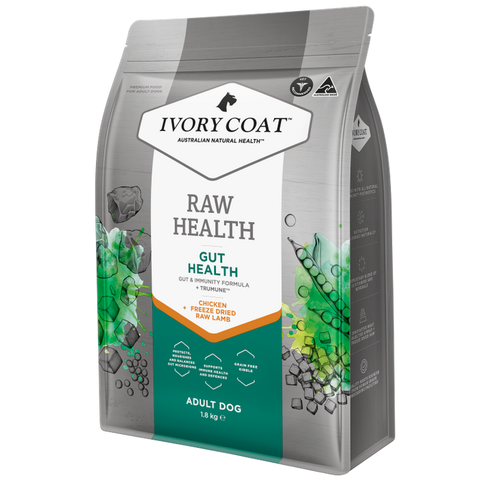"IVORY COAT KNOWS THE POWER OF NATURAL HEALTH SOLUTIONS TO HELP PETS LIVE LONGER, HEALTHIER AND HAPPIER LIVES. OUR TEAM OF SEASONED RESEARCH AND DEVELOPMENT PET FOOD SPECIALISTS, IN CONSULTATION WITH VETERINARY EXPERTS, HAVE CRAFTED OUR ADULT GUT & IMMUNITY FORMULA. IT FEATURES SCIENTIFICALLY VALIDATED NATURAL COMPONENTS INCLUDING TRUMUNE™, ALONG WITH 100% FREEZE DRIED RAW PROTEIN TO PROMOTE HEALTHY DIGESTION AND IMMUNE FUNCTION IN YOUR DOG. OUR RECIPE IS GUIDED BY OUR BELIEF IN FRESHER FEEDING. UNLIKE TRADITIONAL KIBBLE WHICH RELIES SOLELY ON DRIED MEAT MEALS, OUR INNOVATIVE TECHNOLOGY ALLOWS US TO COMBINE AUSTRALIAN SOURCED RAW MEAT INTO OUR UNIQUE FORMULATION, WHICH IS THEN COOKED AND TOPPED OFF WITH 100% FREEZE DRIED RAW LAMB. FREEZE DRYING HAS MINIMAL TO NO EFFECTS ON NUTRITIONAL VALUE, LOCKS IN NUTRITION AND PROVIDES A HIGHLY BIOAVAILABLE SOURCE OF PROTEIN, VITAMINS, MINERALS AND ESSENTIAL FATTY ACIDS. IT'S TAILORED NUTRITION THAT OFFERS EVERYTHING THEY NEED TO LIVE THEIR BEST LIFE! IMMUNITY HEALTH STARTS IN THE GUT BOOSTED WITH ALL NATURAL TRUMUNE™ POSTBIOTICS TO HELP BALANCE THE GOOD AND BAD BACTERIA IN YOUR DOG'S GUT TO PROMOTE HEALTHY DIGESTION, IN TURN, SUPPORTING THEIR IMMUNE SYSTEM FUNCTION. TRUMUNE™ IS AN ADVANCED, NATURAL IMMUNE SUPPORT POSTBIOTIC MADE FROM A PROPRIETARY FERMENTATION PROCESS THAT SUPPORTS PET WELL-BEING AND VITALITY. *TRUMUNE™ IS A LICENSED TRADEMARK OF DIAMOND V, LLC NUTRITION DELIVERED NATURALLY WITH ADDED AUSTRALIAN GROWN CARROT FIBER (NINJINFIBRE®), A SUSTAINABLY SOURCED PREBIOTIC FIBER THAT HELPS PROMOTE THE GROWTH OF HEALTHY GUT MICROFLORA, PROMOTING A HEALTHY MICROBIAL BALANCE WITHIN THE INTESTINE. CONTAINS FLAVONOIDS AND POLYPHENOLS WHICH MAY ALSO AID DIGESTION AND SUPPORT THE IMMUNE SYSTEM. PROPRIETARY BLEND OF 16 VITAMINS AND MINERALS PLUS PREBIOTIC FIBRE AND SUPERFOODS FOR THE ULTIMATE NUTRITIONAL SUPPORT. INNOVATIVE MEAT INJECTED KIBBLE + FREEZE DRIED RAW OUR INNOVATIVE KIBBLE DESIGN COMBINES RAW AUSTRALIAN MEAT COOKED