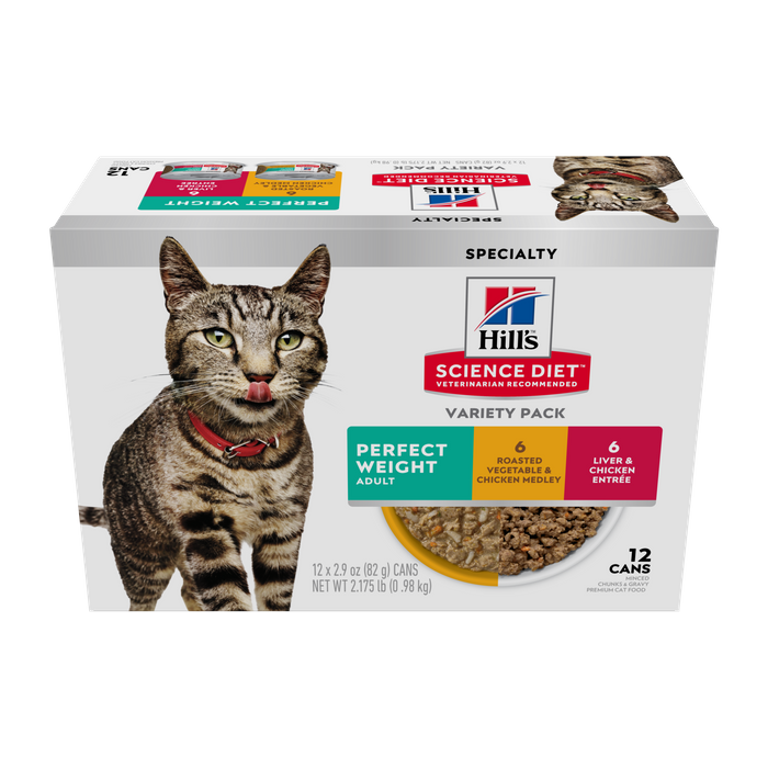 If you're looking for a breakthrough weight management cat food your pet will love, you'll want to try Hill's Science Diet Adult Perfect Weight Vegetable & Salmon Medley. Formulated for long-lasting weight support, this adult wet cat food made with natural ingredients has been clinically proven to deliver results. Over 70% of cats tested with this premium cat food lost weight within 10 weeks (research on file, Hill’s Pet Nutrition, 2011). High-quality protein helps your grown cat maintain lean muscle, while the rich salmon flavour in a mouthwatering sauce makes this an adult cat food your pet is sure to love and benefit from.
