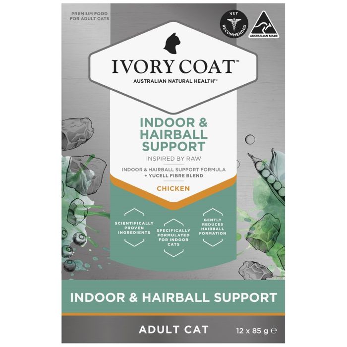 INDOOR & HAIRBALL SUPPORT FORMULA+ YUCELL FIBRE BLENDIVORY COAT KNOWS THE POWER OF NATURAL HEALTH SOLUTIONS TO HELP PETS LIVE LONGER, HEALTHIER AND HAPPIER LIVES. PACKED WITH EVIDENCE-BASED TASTE, OUR ADULT CAT INDOOR & HAIRBALL FORMULA SUPPORTS THE NEEDS OF INDOOR CATS WITH AN ENERGY BALANCED FORMULATION, ADDED QUALITY MEAT PROTEIN TO HELP MAINTAIN MUSCLE MASS.YUCELL FIBRE BLEND (INCLUDING CELLULOSE AND YUCCA EXTRACT) SUPPORTS THE MOVEMENT OF INGESTED HAIR MEANING LESS HAIRBALLS TO CLEAN UP, WHILE ALSO REDUCING LITTERBOX STOOL ODOUR.DESIGNED BY OUR TEAM OF SEASONED RESEARCH AND DEVELOPMENT PET FOOD SPECIALISTS, IN CONSULTATION WITH VETERINARY EXPERTS, OUR PREMIUM WET CAT FOOD HAS BEEN FORMULATED WITH REAL, SELECTED NATURAL INGREDIENTS INSPIRED BY OUR BELIEF IN FRESHER, WHOLESOME FEEDING FOR A BETTER LIFE.INSPIRED BY RAWVET RECOMMENDEDAUSTRALIAN MADE SCIENTIFICALLY PROVEN INGREDIENTSREDUCED CALORIE FORMULA (*) TO MAINTAIN HEALTHY WEIGHTSPECIFICALLY FORMULATED FOR INDOOR CATSGENTLY REDUCES HAIRBALL FORMATION