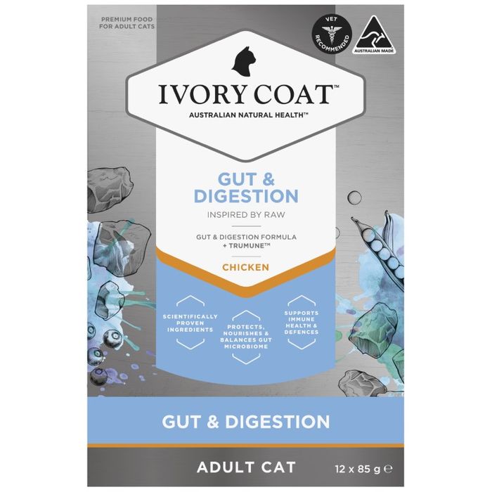 GUT & DIGESTION FORMULA+ TRUMUNETMIVORY COAT KNOWS THE POWER OF NATURAL HEALTH SOLUTIONS TO HELP PETS LIVE LONGER, HEALTHIER AND HAPPIER LIVES. OUR ADULT CAT GUT & DIGESTION FORMULA HARNESSES NATURE’S SCIENTIFICALLY PROVEN NUTRIENTS IN TRUMUNE’S® POSTBIOTIC FORMULATION TO ELEVATE THE HEALTH OF GUT MICROFLORA AND PROTECTING AGAINST HARMFUL BACTERIA. THIS BENEFICIAL FORMULATION ENABLES THE GUT FLORA TO FLOURISH, PROTECTING, NOURISHING AND BALANCING THE MICROBIOME FOR A STRONG IMMUNE SYSTEM. DESIGNED BY OUR TEAM OF SEASONED RESEARCH AND DEVELOPMENT PET FOOD SPECIALISTS, IN CONSULTATION WITH VETERINARY EXPERTS, OUR PREMIUM WET CAT FOOD HAS BEEN FORMULATED WITH REAL, SELECTED NATURAL INGREDIENTS INSPIRED BY OUR BELIEF IN FRESHER, WHOLESOME FEEDING FOR A BETTER LIFE."INSPIRED BY RAWVET RECOMMENDEDAUSTRALIAN MADESCIENTIFICALLY PROVEN INGREDIENTSPROTECTS, NOURISHES & BALANCES GUT MICROBIOMESUPPORTS IMMUNE HEALTH & DEFENCES