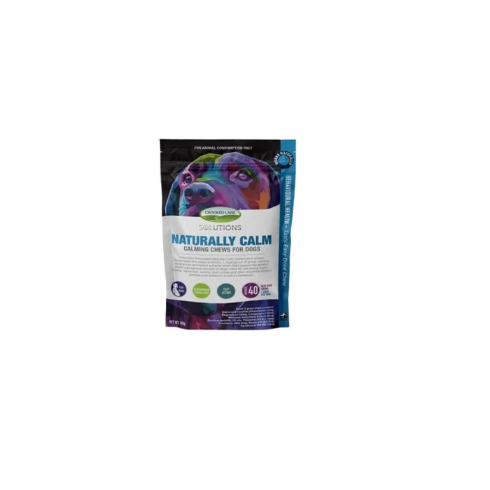 Veterinary formulated Naturally Calm chews are a unique combination of a select probiotic, L-tryptophan, B group vitamins, magnesium and herbal extracts which help support the general health and nervous function in dogs. Ideal for use during travel, training, separation, storms, loud noises and other situations where a positive calm behavior could be beneficial.