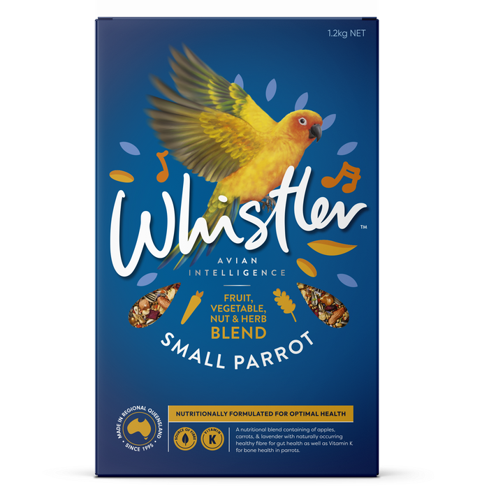 A NUTRITIONAL BLEND CONTAINING OF APPLES, CARROTS, & LAVENDER WITH NATURALLY OCCURRING HEALTHY FIBRE FOR GUT HEALTH AS WELL AS VITAMIN K FOR BONE HEALTH IN PARROTS. FEEDING GUIDE: PROVIDE YOUR BIRD WITH FRESH FOOD EACH DAY. MAKE IT EASY FOR YOUR BIRD TO REMOVE THE NUTRITIOUS KERNELS FROM THE SEEDS BY DISCARDING THE EMPTY HUSK. ENSURE YOUR BIRD HAS FRESH WATER DAILY. ADDITIONAL SELECTED FRUITS AND VEGETABLES SHOULD BE GIVEN TO YOUR BIRD AS A HEALTHY TREAT. CLEANING: YOUR BIRD CAGE, FEEDER, WATER BOWL AND TOYS NEED TO BE CLEANED IN LIGHT SOAPY WATER THOROUGHLY EVERY 6 DAYS, RINSE IN CLEAN WATER AND DRY THOROUGHLY. REPLACE WITH FRESH WATER AND WHISTLER BLEND. INGREDIENTS: (FORMULA MAY VARY DUE TO SEASONAL AVAILABILITY) CANARY SEEDS, GREY SUNFLOWER SEEDS, JAPANESE MILLET, PEANUTS, WHOLEGRAIN OATS, CARROT, PINEAPPLE, SAFFLOWER, BEETROOT, WALNUTS, APPLE, LAVENDER FLOWER, CORIANDER.