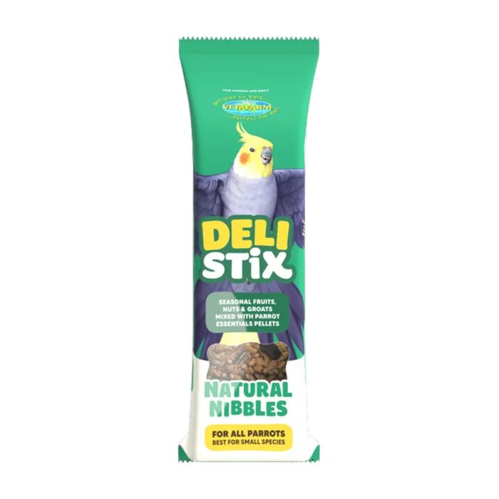 Parrots are intelligent and curious creatures, and their wellbeing depends on good nutrition and enrichment. Deli Stix Natural Nibbles is a natural foraging treat bar that encourages your feathered friend to engage their natural instincts, all while diversifying their diet!Made with a blend of premium seeds, Australian seasonal nuts and dehydrated fruits and Vetafarm’s Parrot Essentials pellets – Natural Nibbles ensures your bird is receiving balanced nutrition with every nibble.With Vetafarm’s unique 100% natural plant-based binder and a recyclable cardboard hanger, Natural Nibbles is not only a delight for your parrot, but also kind to the planet! There is no plastic stick, and no glue binder.Let your small parrots enjoy a rewarding challenge that keeps them happy and healthy—one tasty bite at a time!