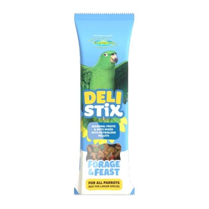 Give your parrot the best of what nature has to offer with Deli Stix Forage & Feast—a treat that cares for their health and happiness! Deli Stix Forage & Feast is a natural foraging treat bar that encourages your feathered friend to engage their natural instincts, all while diversifying their diet!Formulated by vets, each bar contains a carefully selected blend of Australian seasonal nuts, dehydrated fruits and Vetafarm’s Nutriblend pellets, providing essential nutrients in a form that mentally engages your bird.With Vetafarm’s unique 100% natural plant-based binder and a recyclable cardboard hanger, Forage & Feast is not only a delight for your parrot, but also kind to the planet! There is no plastic stick, and no glue binder.Let your parrots enjoy a rewarding challenge that keeps them happy and healthy—one tasty bite at a time!