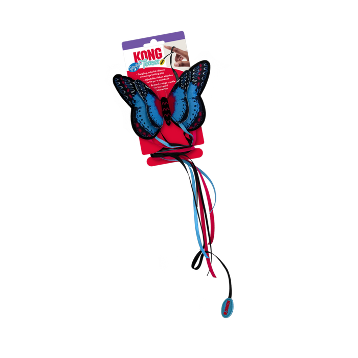 KONG® Butterfly Teaser will make your cat’s heart flutter! The adjustable ribbon design offers a variety of playstyles from interactive to solo play by attaching it to your finger, a doorknob, handle, or hook. The colorful, dangling ribbons will invite swatting and chasing, while the crackling sound of the butterfly’s wings spark your cats natural prey instincts to pounce and bat. Whether you are at home or out and about, the Butterfly Teaser will keep your cat entertained and exercising throughout the day!