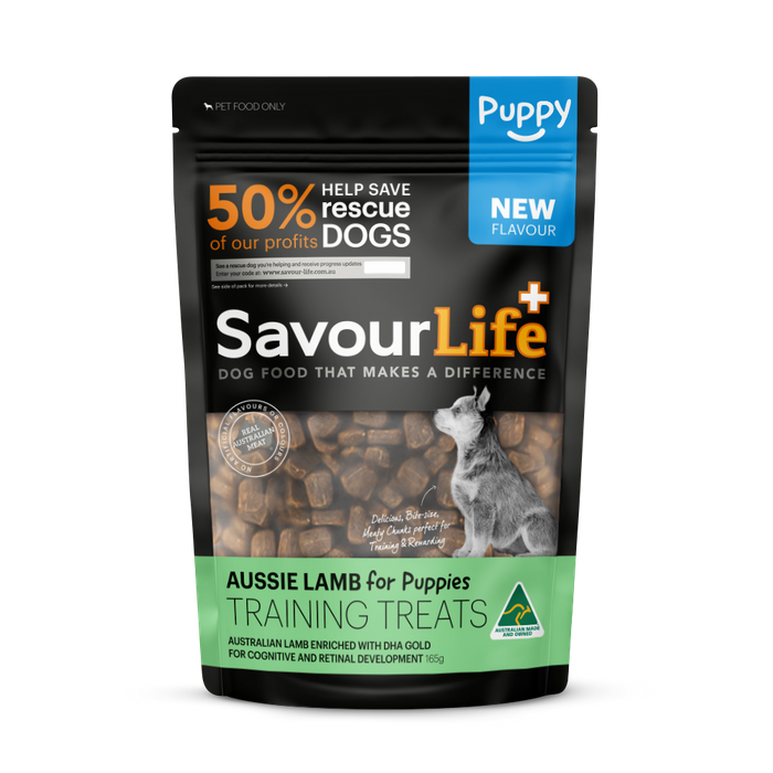 SavourLife’s Puppy Lamb Training Treat is packed full of meaty goodness and inclusions like DHA GOLD aimed at helping your puppy grow and develop to be the best dog they can be. Expanding on our extremely popular Training Treats range, our treats made right here in Australia from real Australian meat and all natural ingredients. This ensures your puppy is getting nothing but the best. Great to have on hand when you are walking, training or just having fun! We have done the hard work for you! These tasty bites are perfectly sized in little cubes to easily train and reward. No more cutting up meat or trying to break treats with your hands! Our Puppy Lamb Training Treats with DHA GOLD are high-value; that’s training speak for ‘your dog will do anything for the taste!’ Not only do dogs love them, they are healthy too! They are enriched with DHA GOLD that aids with your puppies cognitive and retina development. Made with Australian Lamb that is good alternative to more common protein sources and is gentle on sensitive tummies too. Sweet Potato, which puppies not only love the taste of, are also rich in beta-carotene, a mineral essential in the supported development of bone growth, skin and vision. Vitamins and minerals that support the creation of the bodies essential building blocks. As an added bonus they are low in fat and salt. SavourLife is an Australian owned and operated company, they produce Australian-made dog food and donate 50% of their profits to pet rescue organisations; helping them save and re-home abandoned dogs.
