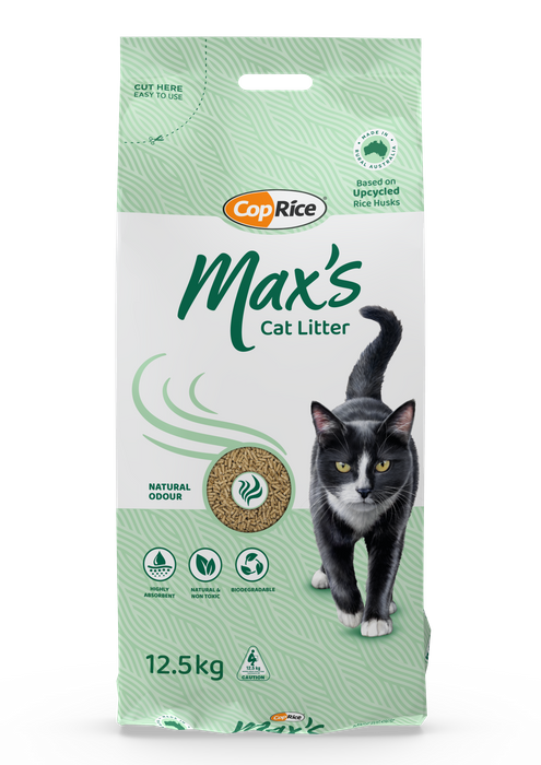 MAXS CAT LITTER MADE WITH UPCYCLED RICE BY-PRODUCT & IT IS BIODEGRADABLE, HIGHLY ABSORBENT, NON-TOXIC WITH A NATURAL ODOUR