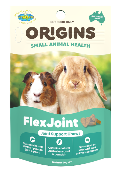 Arthritis is becoming a more commonly seen issue in small animals such as rabbits and guinea pigs, particularly as our care for the animals improve and lifespans increase. There can be many factors that contribute to the development of joint issues such as:•Age - rabbits and guinea pigs older than 5 are more likely to develop arthritis.•Obesity – high body weight puts pressure on joints and restricts movement.•Previous trauma – previous joint injuries are more likely to cause issues later on.•Poor nutrition – if not fed a balanced diet, bones and joints may not have the nutrition they need to form correctly and maintain strength.FlexJoint contains a combination of plant-based glucosamine and MSM to help provide joint health support for small animals in an easy, tasty chew. Glucosamine provides nutritional components for the maintenance of healthy joints, supporting joint function and repair. MSM is a naturally occurring supplement known for its anti-inflammatory and antioxidant benefits.