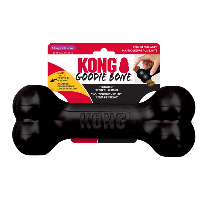 The KONG Extreme Goodie Bone™ toy delights dogs that are the toughest of chewers and that delight in chew sessions. Made from the most durable KONG Extreme unique, natural black rubber formula this bone is designed for determined chewers. The KONG Extreme Goodie Bone™ also features patented Goodie Grippers ™ that turn this entertaining toy into a fun treat dispensing challenge that can be stuffed with your dog’s favorite kibble. Want to extend the chew session? Stuff with KONG Snacks™ and entice with a bit of KONG Easy Treat™.