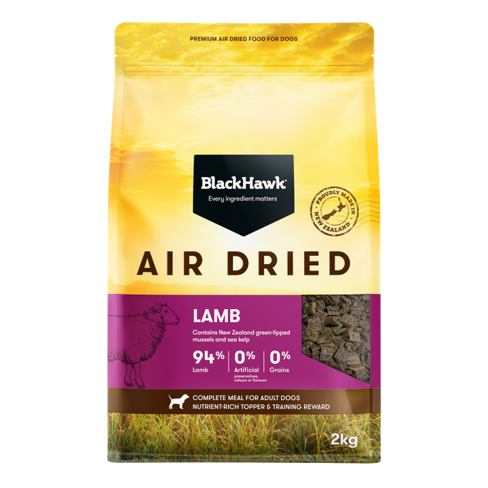 Made with 94% New Zealand lamb, including liver, Black Hawk Air Dried Lamb is a highly nutritious, complete and balanced diet for adult dogs. Gently air dried at low temperatures, it naturally preserves essential nutrients while enhancing the flavour and taste of the ingredients. Rich in protein and amino acids, this premium recipe supports muscle development and overall wellbeing. It also includes green-lipped mussels, known for their natural chondroitin content, to support dogs’ joint health. With its soft texture and bite-sized pieces, it’s easy to serve as a complete meal or as a nutrient-rich topper to enhance your dog’s existing diet. It can also be used as a tasty, high-protein treat. Proudly made in New Zealand.